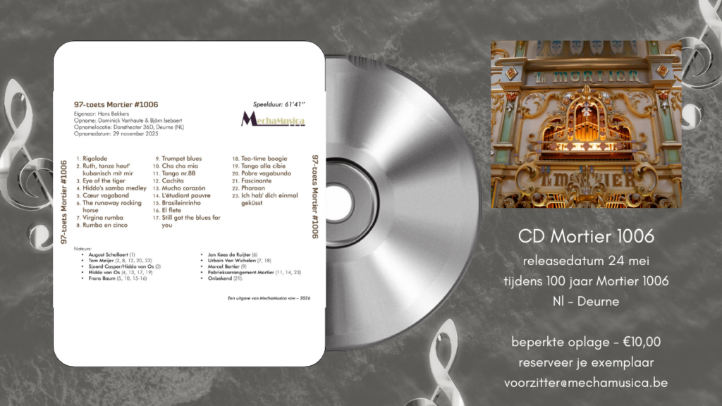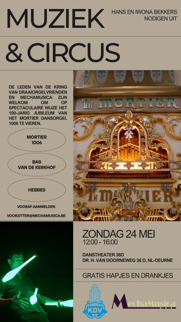 Op zondag 24 mei 2026 (eerste Pinksterdag) nodigen Hans en Iwona Bekkers alle leden van MechaMusica en de Kring van Draaiorgelvrienden uit om de 100ste verjaardag van 97-toets Mortier-dansorgel #1006 mee te vieren, en het belooft spectaculair te worden dankzij de medewerking van Europees jongleer kampioen battle 2026 Bas Van De Kerkhof met een spectaculaire lichtkegelvoorstelling, ondersteund door de groep Hebbes met ballen, eenwielers en steltendansers. Tom Meijer heeft voor een extra aantal nieuwe 97-toets boeken gezorgd.
